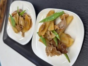 ② 豚 肉 は 1 c m 幅 に 切 り 、 軽 く 塩 、 こ し ょ う を し て 小 麦 粉 を ま ぶ す 。