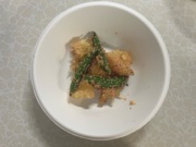 ①スナップエンドウは、すじを取り塩で少しもんで1分ほど茹でる。