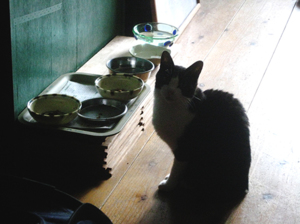 だいたい、ゴハンと水の器の前で、コチラをジー—————————ーっと見つめています。