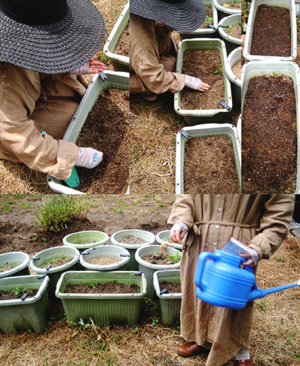 大人の妖精と、胡麻と胡瓜の種をまき。