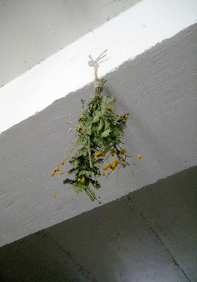 ミモザのリース講座で作った、ミモザのミニスワッグも、なんとなく飾ってます。