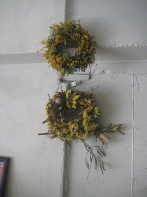 今年の春のリース、ミモザのリース、部屋に飾ってたんだった。