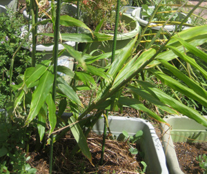 生姜の葉っぱヒトツ折れて、シレーッと支柱で支えて戻して