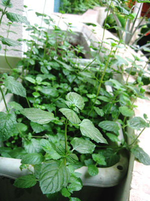 ミントが縦にも横にも鉢から飛び出して、ピーン。増殖中。