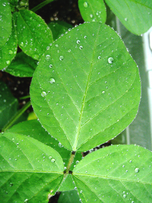 新入り枝豆の葉っぱは、水気をはじく気満々で元気である。