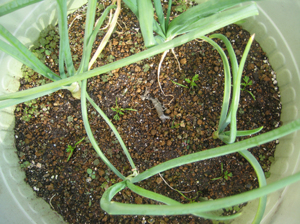 植え直す場所がなくて、また、ホーム玉ねぎの鉢内の空きスペースにお世話になるコトに。。