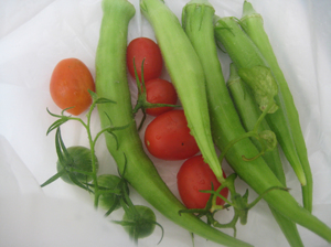 天空で落ちてたミニトマトと、室内の収穫オクラ。