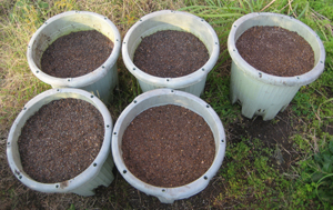 培養土と培土(世の中に初めて出した土)の鉢、すでに乾燥していた。