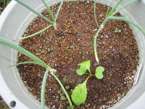 植え残りは、お隣さんの玉ねぎの鉢の空いた箇所と、室内シソの鉢の空いた箇所に、移植してみた。