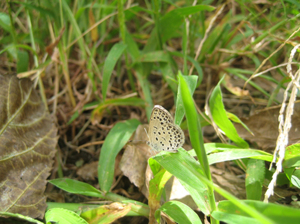 桑の葉が枯れて散り始めているので、背景が秋っぽいですね、ヤマトシジミ。