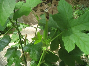 natu-gardenにて、本体葉無し状態から見事再生して復活して実を付けたオクラ!