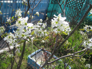 ネコヤナギっぽい芽を付けていた木は、いつのまにか白い花でいっぱいになっていました。