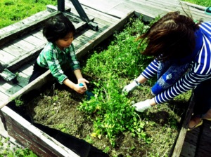 (写真は、cross fmファームのハーブアドバイザー紘子先生とたっくん。ハーブコンテナをお手入れ中♪)