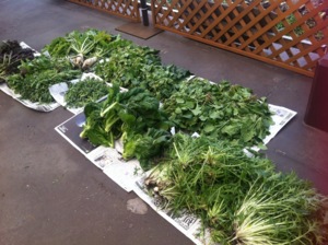 三池高菜、こぶ高菜、かつお菜、水菜、からし菜、わさび菜、ほうれん草、大根、春菊などなど。