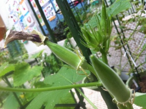 枯れた花を突き上げるように、下から実が伸びてきて、開花後3〜4日で収穫です。