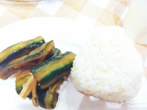 *クロスファーマーの柳井さんがくわのさんのお米で作った「おむすび」と「キュウリ漬け」