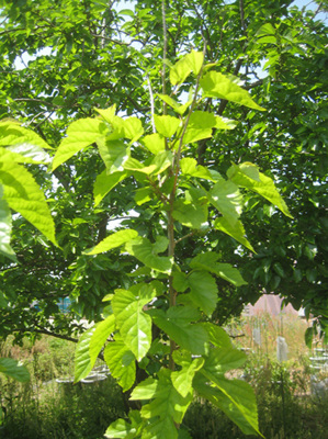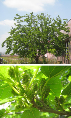 手前でプランターの中で育った桑の樹も、もう背が高い。