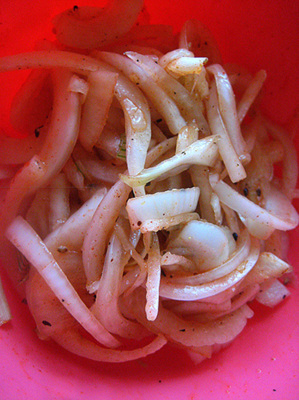 新玉葱 特大の半分。中1個くらい?縦切り横切り半々。