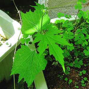 妖精がアボカドの鉢に植えたのも根付いて木陰で生長中。