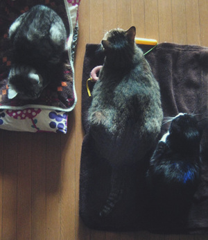 で、完成。で、まあ、あんのじょう、毛のかたまりたちの「乗り祭り」が始まる。。。