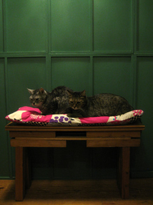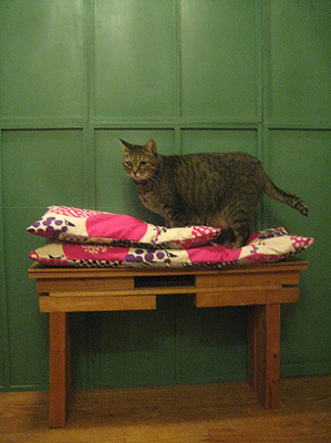 長いほう=人間用お座ブと、中くらいのほう=猫様用お座ブ。