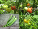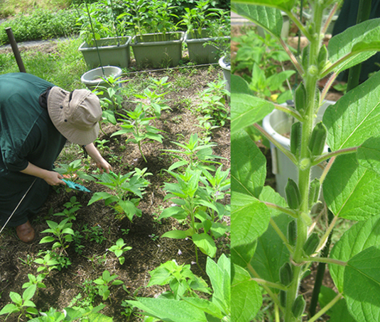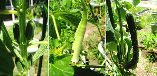 左から、ゴマの莢、八丈オクラ、スーヨー胡瓜。
