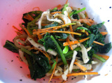 適当に包丁で千切り?細切り?した人参と、適当に切った小松菜と、切り干し大根と黒ゴマでサラダ。