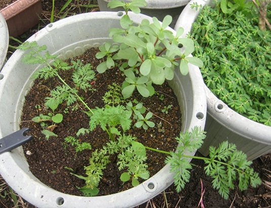つうか、ゴーヤの鉢内から出てきてる謎の植物もいっこうに名前がわからないワケで。
