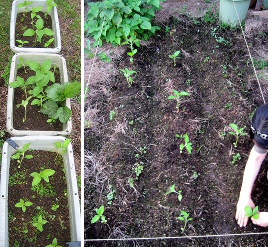 地植え胡麻組のあいまあいまに、間引き組を植え直してみた。