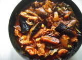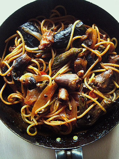 のちに、茄子とオクラとニンニクと玉葱とケチャップと青トマトの酢漬け、赤ワイン、魚醤、