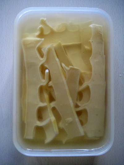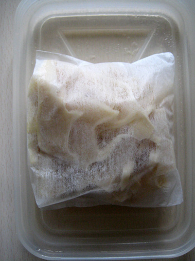 水気を切って、メンマサイズに切って、お茶パックに入れて、糠床へ。