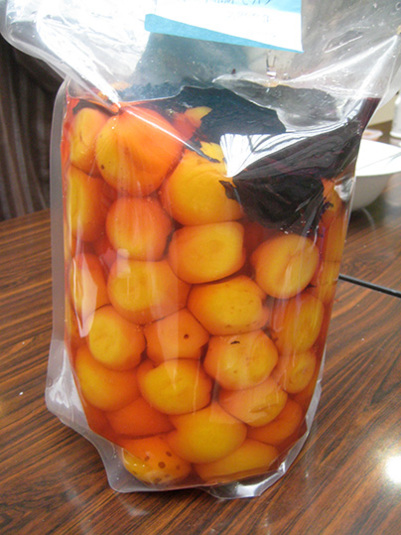 先生が5日前に漬けた、梅酢が既にあがってきている「講座当日見本」をいただきましてな、