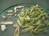 むきえび、ニンニク、人参、和菓子作りでよけといたグリーンピース数個、