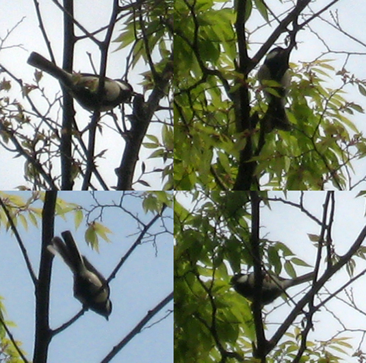 シジュウカラ、必死に鳴いては、別の樹にいるパートナーといろいろと連絡しあっている模様。