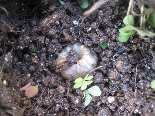 ぶっとい根を取るため、土を軽くほじっていたら、幼虫デテキタ♪