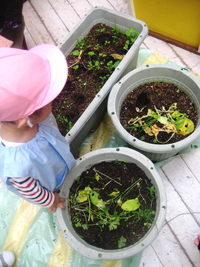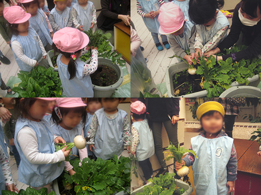 1人だけで穫れるようになった子、今日初めて野菜を収穫する子、