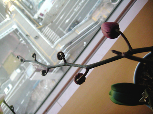 赤紫色の胡蝶蘭にもつぼみが付いているが、