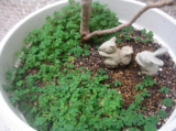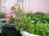 間引き植え直し組もワサワサしてる。(画像上部2鉢。左が小蕪、右がミニダイコン)