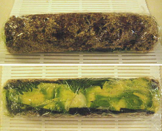 アボカドや天空で育った小蕪、を包丁でスライスと、大葉と、海苔と、まきすでおすおす。