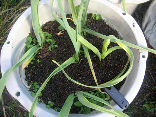 ニンニク鉢内と玉葱の鉢内の小蕪のサイズの差www
