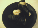 お湯で蒸して温め直した玄米に合わせ、海苔で包んでおにぎり。