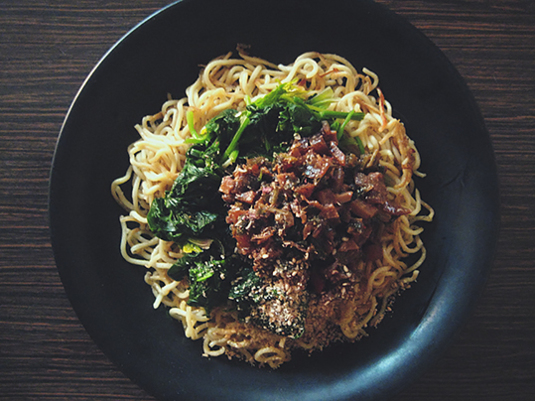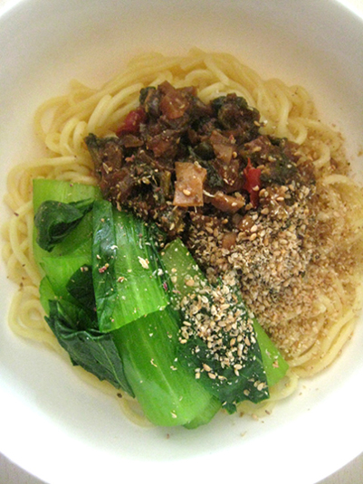 1杯目は、汁なし担々麺もどき。ちゃんぽん麺で。サッと茹での青梗菜乗せ。適当に切って乗せ。