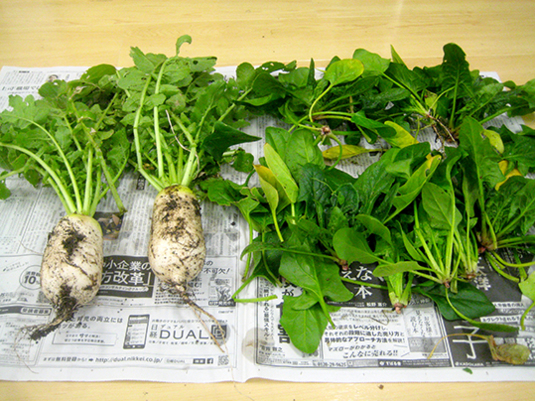 天空で育った、ミニダイコン、ほうれん草。