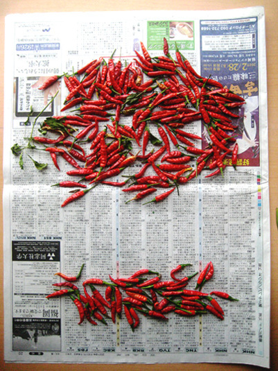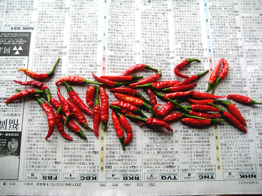 先日から乾燥させてる唐辛子と一緒に、乾燥始め。