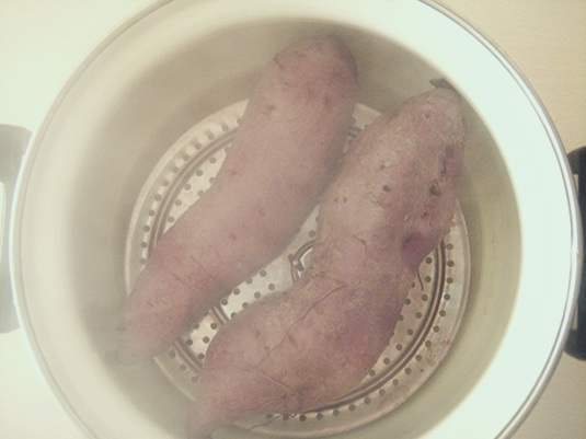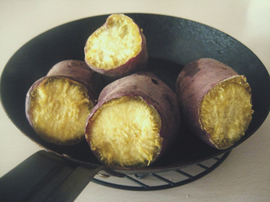 蒸した芋、さらにジリジリ焼きまして。石焼き芋ですわ。