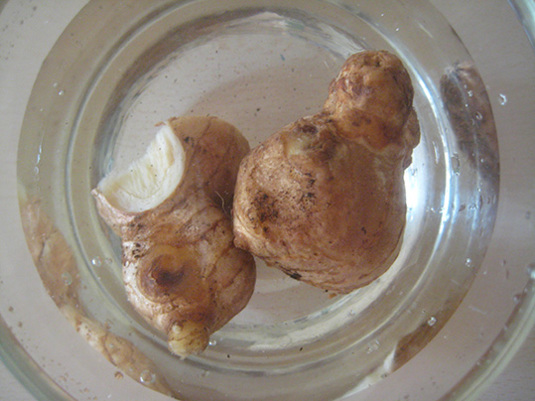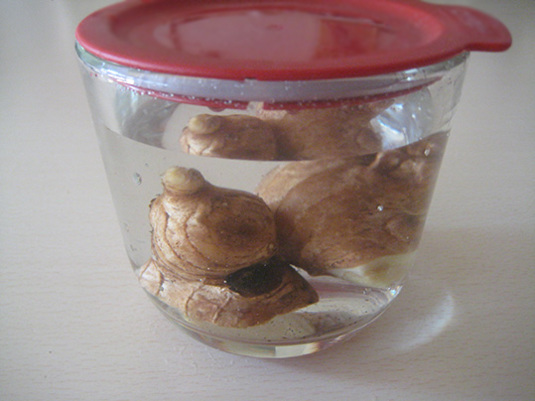生姜、深めの容器に入れ直して、水に入れる保存法でキープ中。