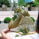 枯れた大きなハスの葉っぱを器にして、小さな花を投げ入れた作品を。