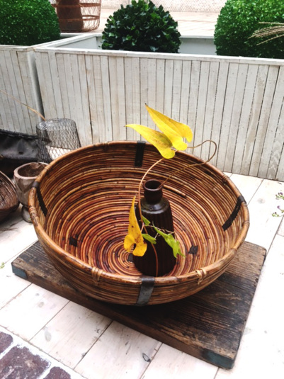 先生は、最後の最後、インドの篭に陶器を入れて、芋の蔓・葉っぱだけを使って投げ入れた作品を。