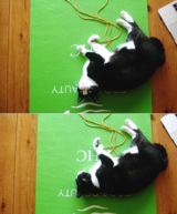 この猫だけが寄ってきます。ひもをくわえて、その場で落とし、コチラを見つめる。
