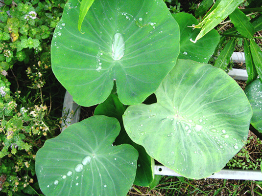 いつもより多めです、里芋の葉っぱの雫。